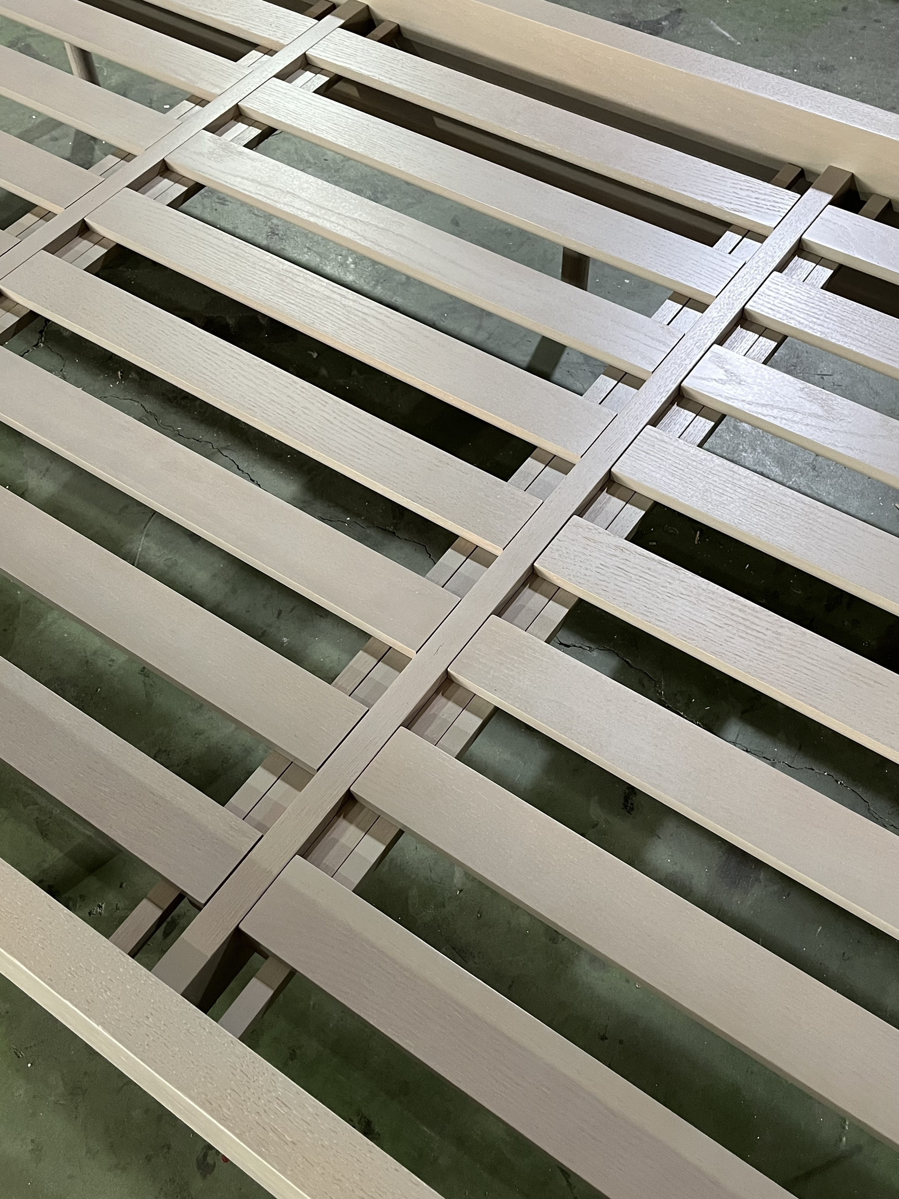 The bed frame is planned according to the layout of three tatami mats. Each section is supported with full horizontal reinforcements underneath, distributing weight evenly and preventing sagging. When stepped on, it feels firm and stable, properly supporting the load between each tatami section for reliable daily use.