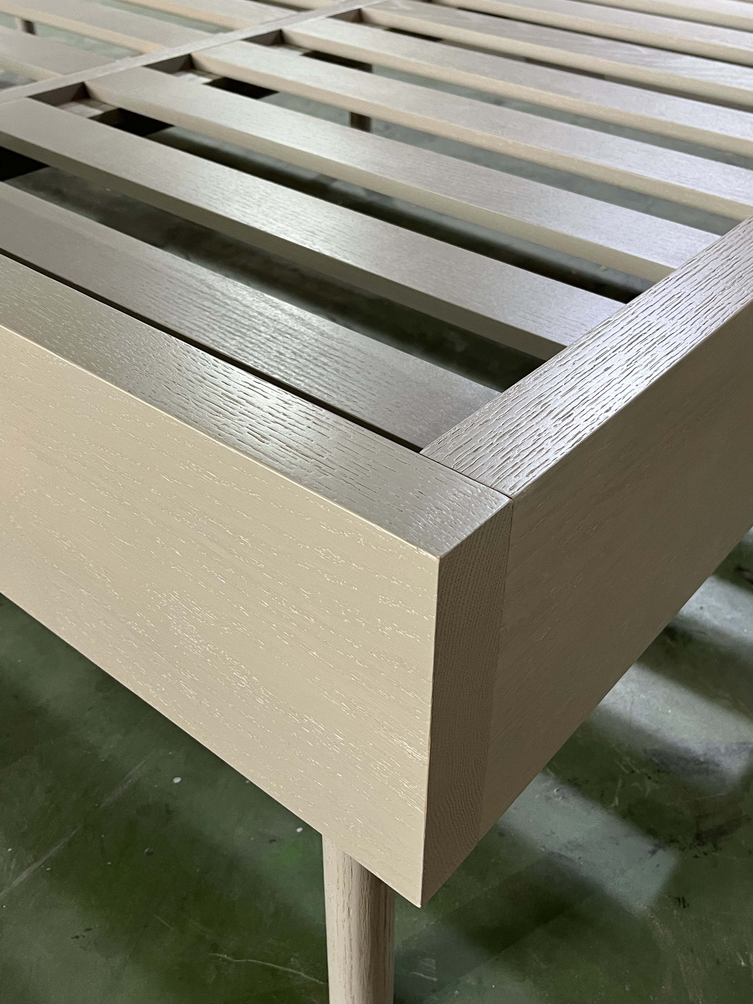 在看不見的床框連接處使用公母榫結合,維持整體俐落外觀,同時確保結構穩固。